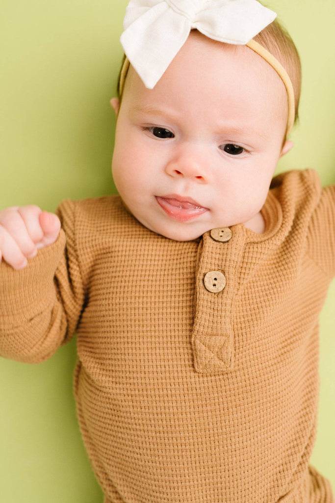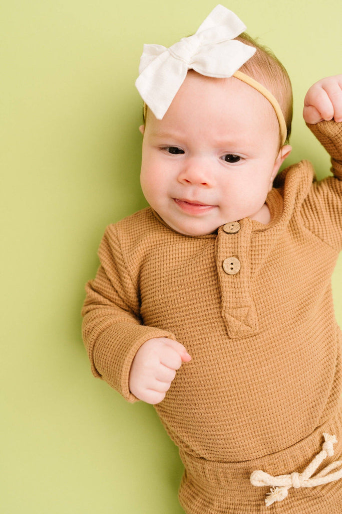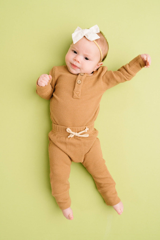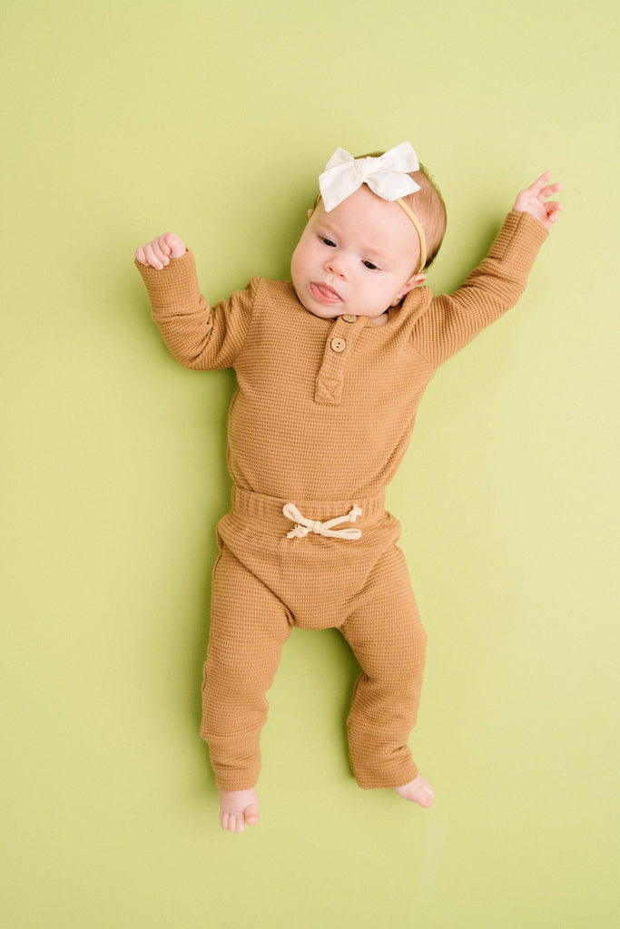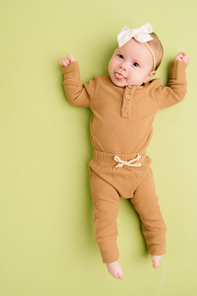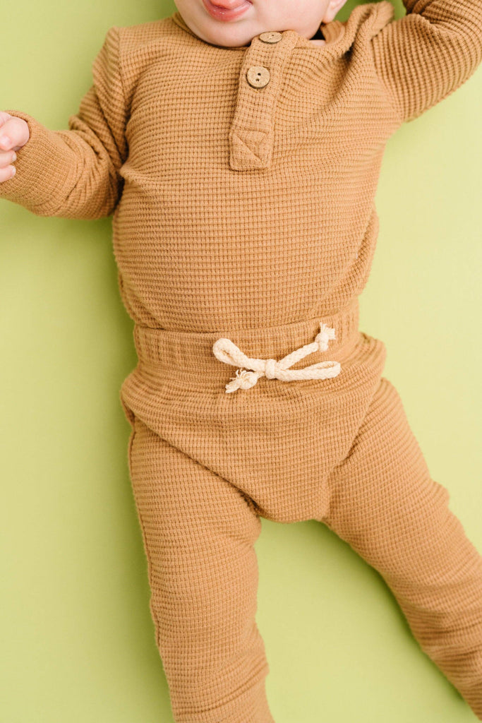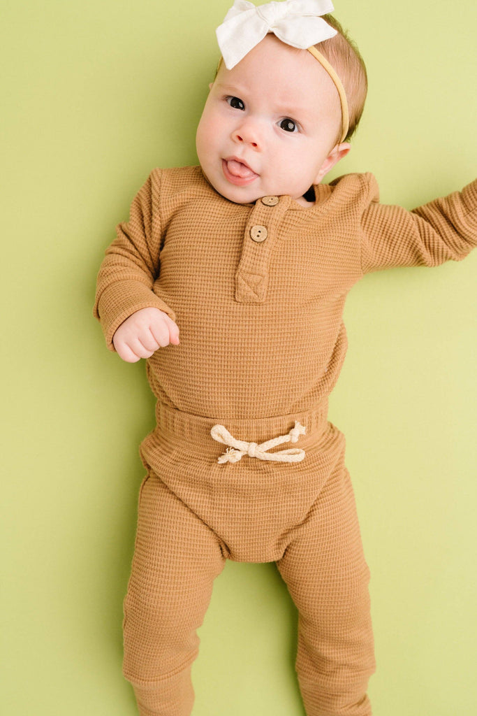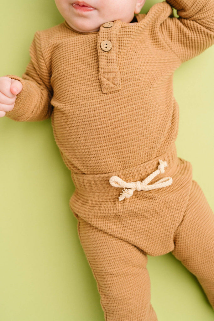 Welcome to Little One Shop, where we believe in comfort, style, and affordability. Our Toasted Almond Waffle Cozy Set, a top and pant set for your baby, is thoughtfully designed to be modern yet comfortable. The neutral tones of toasted almond make it a versatile addition to your baby's wardrobe. We ship quickly from the USA and offer hassle-free returns. Dressing your little ones in our brand is an honor for us. Enjoy the cozy, trendy, and different baby clothing we offer.