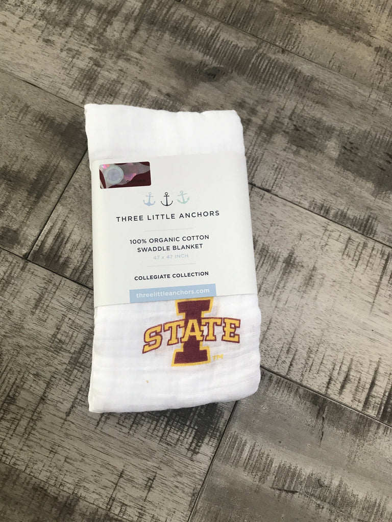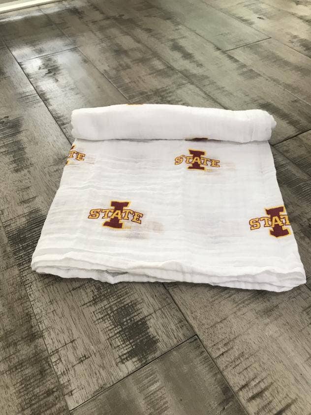 Go Cyclones! Officially licensed Iowa State University 100% cotton muslin swaddle blanket. This blanket is generously sized (47x47in) that allows for longevity of use beyond the swaddle.