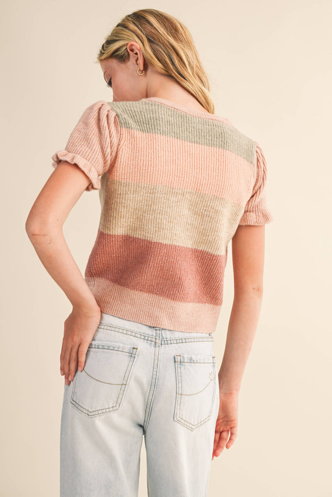 Add cozy charm and playful color to your girl's wardrobe with this soft knit sweater. Designed with wide horizontal stripes in muted pinks, sage green, and beige, this top offers a modern twist on a classic style. The short puff sleeves with subtle ruffle edges give it a sweet, feminine flair, while the ribbed knit adds comfort and texture.