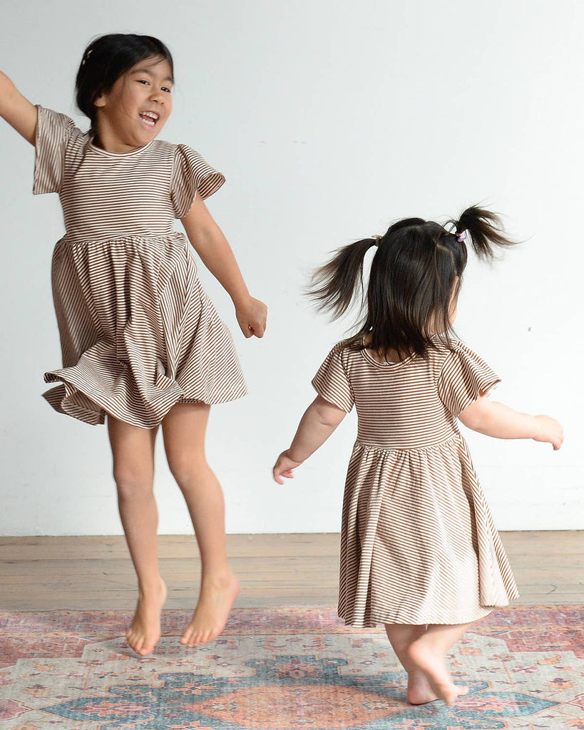 Made with the softest 100% combed cotton jersey. Featuring flowy sleeves, a soft elastic waist, and a flared bottom perfect for twirling. In our classic toffee stripe, this dress is perfect to twirl from spring to summer! Manufactured for City Mouse in Thailand.